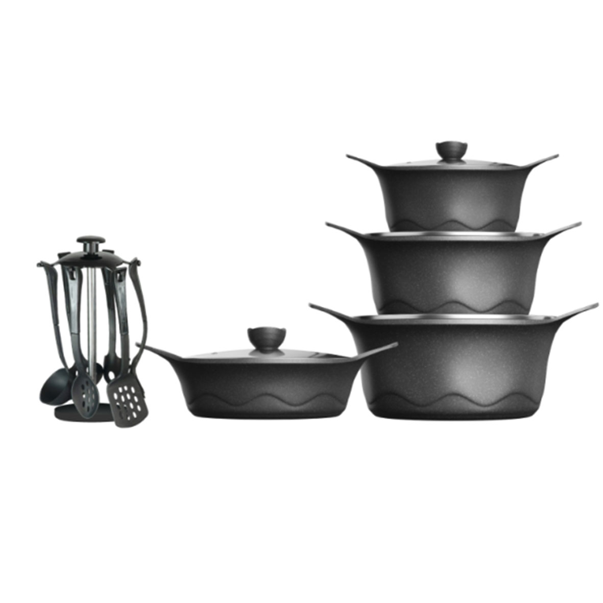 این سرویس شامل یک قابلمه نچسب با روکش گرانیتی و اسنو سایز ۲۰، یک قابلمه نچسب با روکش گرانیتی و اسنو سایز ۲۶، یک قابلمه نچسب با روکش گرانیتی و اسنو سایز ۳۰، یک تابه دو دسته نچسب با روکش گرانیتی و اسنو سایز ۳۰، دو دستگیرهی سیلیکونی و ۶ عدد کفگیر، ملاقه و استند است.
